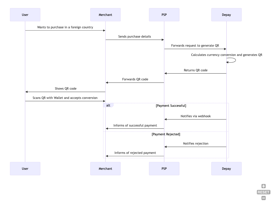 When a user wants to make a purchase in a different country, the merchant sends the purchase details to their local Payment Service Provider (PSP). The PSP forwards the request to Depay, which calculates the currency conversion and generates a QR code compatible with the user's currency. The merchant presents the QR code to the customer, who scans it, accepts the conversion, and completes the payment. Once the payment is credited, Depay notifies the PSP via a webhook, who in turn informs the merchant of the payment outcome.